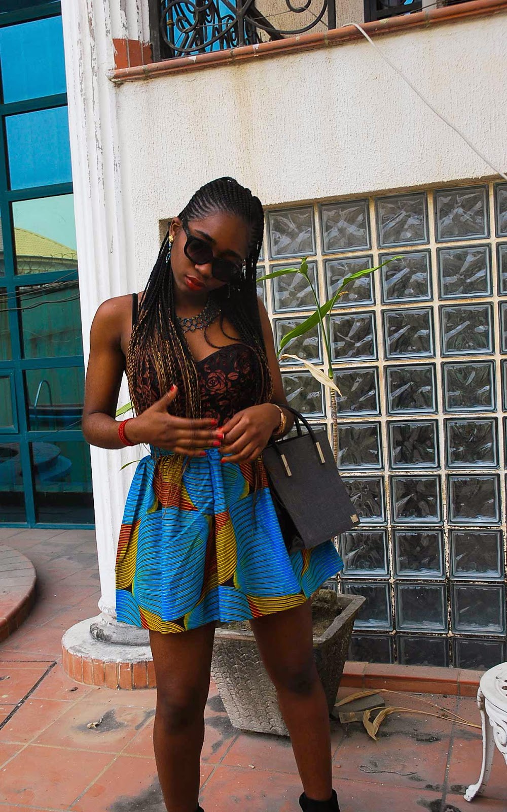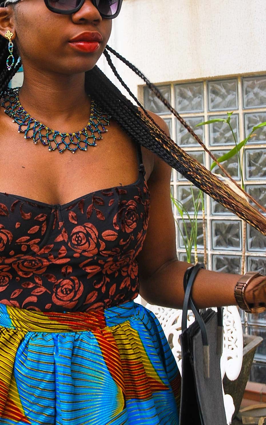 Baby Doll I’m reveling in the playfulness of this outfit. I decided to bring some summer to Miss LAJA since I can’t have it in real life with this cold. Oh well… I love how both patterns mix well with each other. Another example of how wearing pattern on pattern (florals+ankara) isn’t as horrible as you thought it to be, haha. I matched it with a stunning Fulfill Jewelry set that reminds me of nets for some strange reason and I borrowed my mum’s purse to complete the look. The perks of having a stylish mum that you share stuff with, woop woop! You might have already noticed from my past post that I did ombre braids. I’ve been wanting to do them for over a year after spotting a lady in the airport. I literally stalked her just to take a picture of her hair. Not creepy at all. This is another one of the skirts that’s available for purchase so hit me up if you’re interested. There were lots of ups this week that left me feeling so grateful. I can’t wait to share with you and I hope you stick around to find out. Till then, have a swell weekend and I’ll talk to you in a bit! Outfit details Ankara skirt: available for sale 🙂 Bodysuit: similar here Shoes: American Apparel (similar here) Sunglasses: Kensie Jewelry: Fulfill Jewelry Purse: Mummy LAJA (similar one on sale here) Always, Miss LAJA